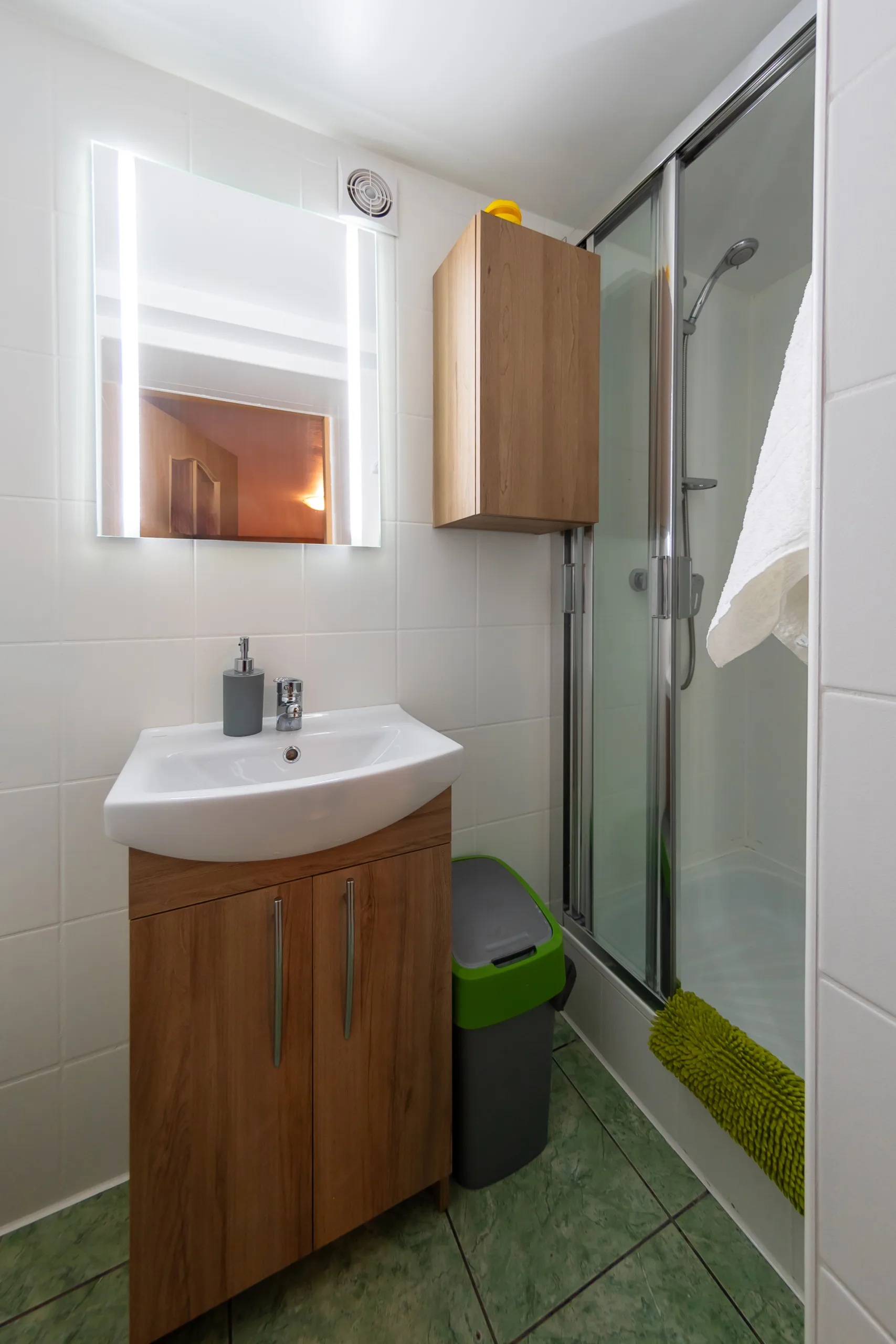 prywatna z kabiną prysznicową, dywanik łazienkowy, ręcznik, mydło w płynie, papier toaletowy